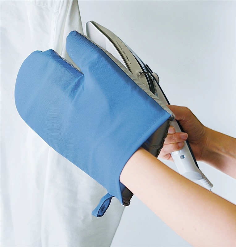 ハンガーに衣類をかけた状態でアイロンがけができるグッズです(スチームアイロン専用)。親指を入れる箇所があり、衣類を抑えた状態でのアイロンがけも可能です。吊るして保管できるループ付き。
