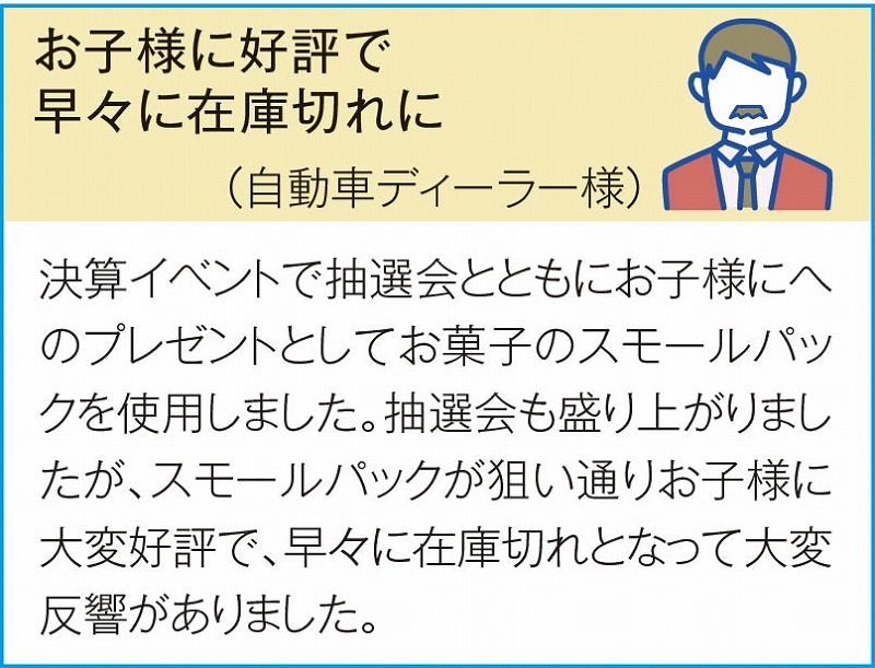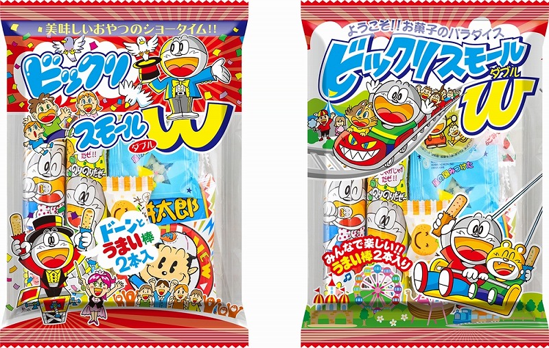 駄菓子が8個入ったパックを2種類のデザインにてお届けします。
