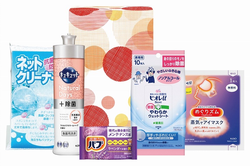 [セット内容] ・花王 キュキュット240ml(NaturalDays+除菌ワイルドフラワー&ハーブ)×1 ・花王 めぐりズム蒸気でホットアイマスク(無香料)×1 ・花王 バブ(ラベンダーの香り)×1 ・花王 ビオレu除菌やわらかウェットシート10枚(ノンアルコール)×1 ・ネットクリーナー×1