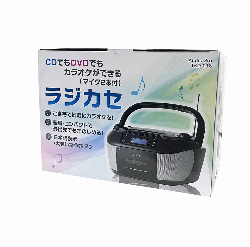 ・届いてすぐにカラオケが楽しめるマイク2本付き。 ・ラジカセ本体をテレビに接続するだけでDVD鑑賞が可能。 ・DVDのカラオケソフト(別売)を使用すれば大画面でカラオケが楽しめます。 ・CD盤でもボーカルカット機能でカラオケが可能。付属のマイクにはデュエット、エコー機能搭載。 ・カラオケで歌ったらそのままカセットテープへ録音可能。 ・軽量・コンパクトで持ち運びもらくらく。 ・多機能の操作に便利なリモコンが付属。 ・付属のAVケーブルでテレビの入力端子(赤白黄)へ繋ぐだけのカンタン接続。 ・CD鑑賞・カセットテープ再生・録音・AM/FMラジオ(ワイドFM)・USB/SD再生機能と1台で4役5役の多機能ラジカセです。