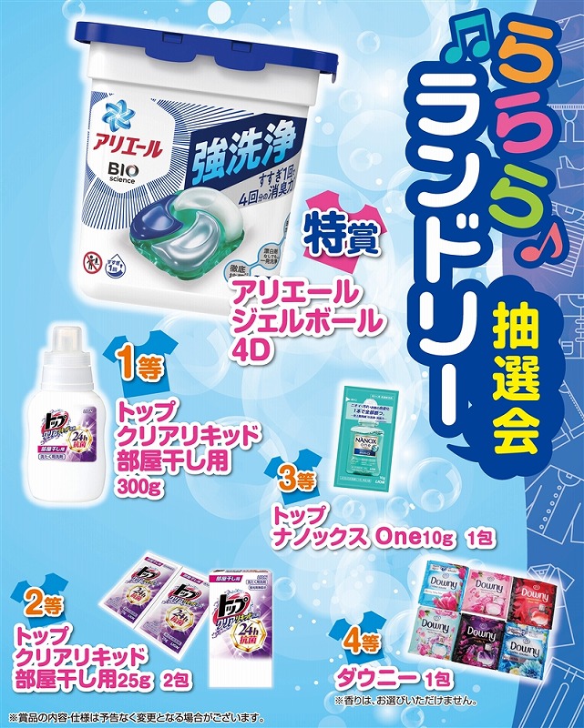 [キット内容] [特賞]アリエール ジェルボール4D・・・3本 [1等]トップ クリアリキッド部屋干し用300g・・・5本 [2等]トップ クリアリキッド部屋干し用25g 2包・・・6本 [3等]トップ ナノックスOne10g 1包・・・16本 [4等]ダウニー 1包・・・70本 [付属] 抽選くじ×100、抽選箱×1、くじ明細書×1、告知用A4カード×1 ※賞品の内容・デザインは画像と異なる場合があります。あらかじめご了承ください。