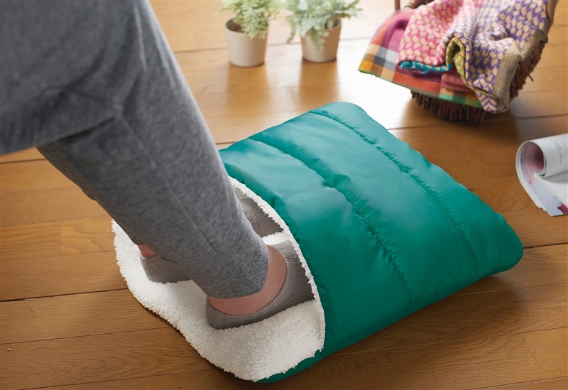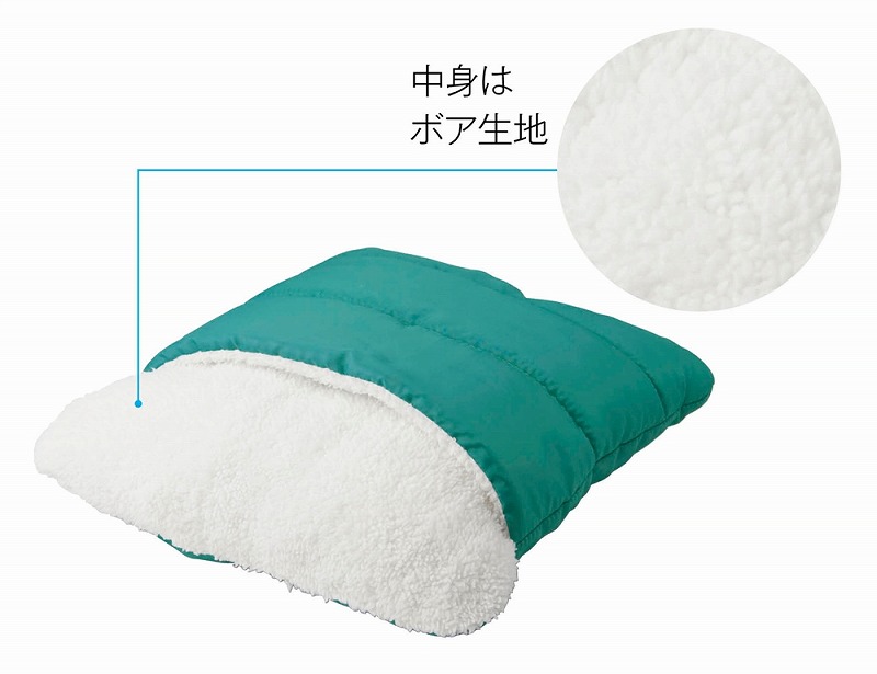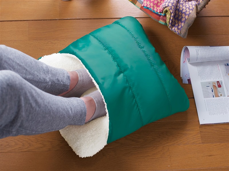 全体的に清潔感のあるグリーンをベース色にして、内生地は白いボア生地を使用しています。ご自宅でのリビングや書斎などに置いておくだけで、スッと簡単にご使用いただけますし足元が暖かく快適な時間を過ごして頂けます。