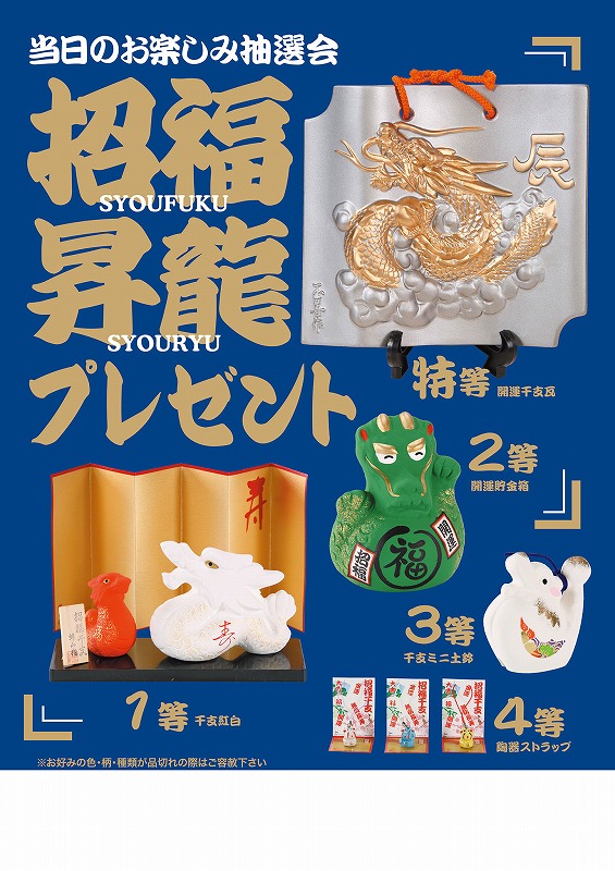 特等:開運干支瓦×1コ・1等:干支紅白×2コ・2等:開運貯金箱×4コ・3等:干支ミニ土鈴×6コ・4等:陶器ストラップ×17コ/A3ポスター/抽選箱/くじ30枚/くじ明細書/店頭用お知らせPOP2枚