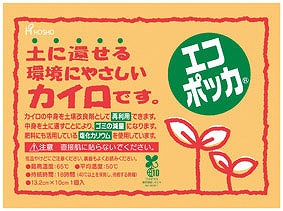 エコポッカは原料に塩化カリウムを使用する事で、 使用後の中身(カイロ本体黒い粉)を土に還せるようにした環境に優しいカイロです。