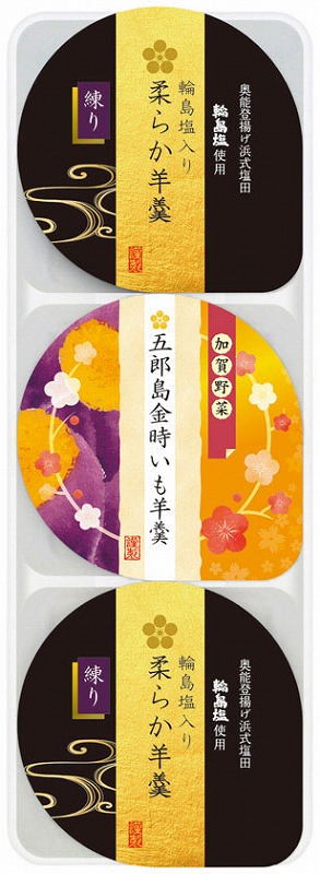 内容量/3個(輪島塩入り柔らか羊羹60g×2・五郎島金時いも羊羹60g×1)、賞味期間/製造日より180日、日本製