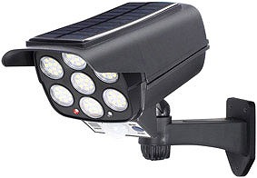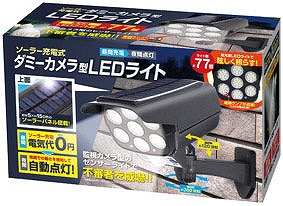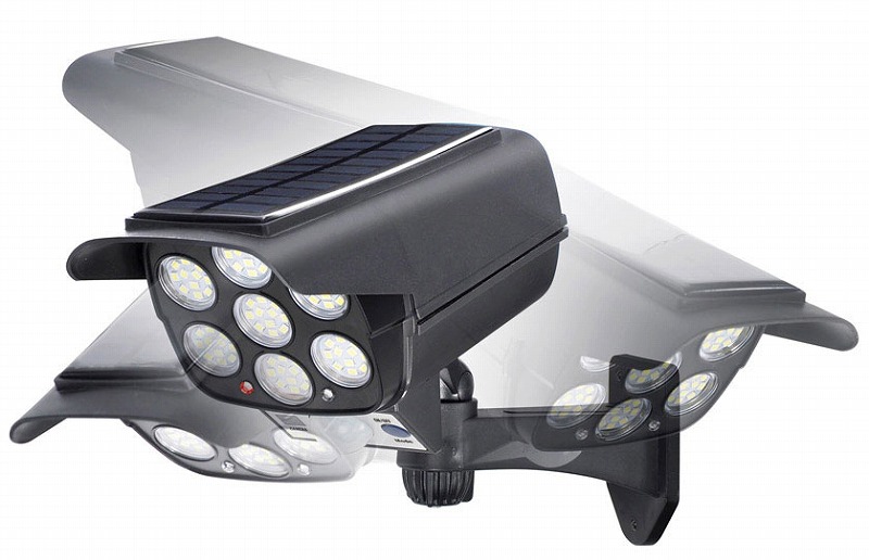 監視カメラ型センサーライトで不審者を威嚇! 暗闇での動きを感知して自動点灯します。 ソーラー充電で電気代¥0です。