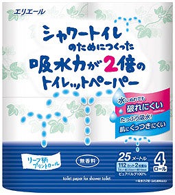 水に濡れても破れにくくたっぷりの吸収力で 肌にくっつきにくいシャワートイレのために つくったトイレットペーパーです。