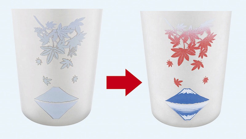 熟練の技巧 信頼の日本製。冷たい飲み物を注ぐと絵柄の色が変化します。