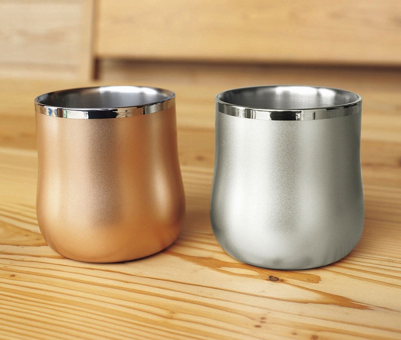 二重構造なので氷を入れても結露が出にくく温かさ・冷たさが長持ちします。18-8ステンレスで丈夫で衛生的です。外面にポリエステル樹脂塗装を、口元はミラー仕上げを施し、高級感に満ちた仕上がりに作り上げました。新潟県燕市の工場で造られた安心・安全・高品質を約束するマーク「メイド・イン・ツバメ」認定取得商品です。
