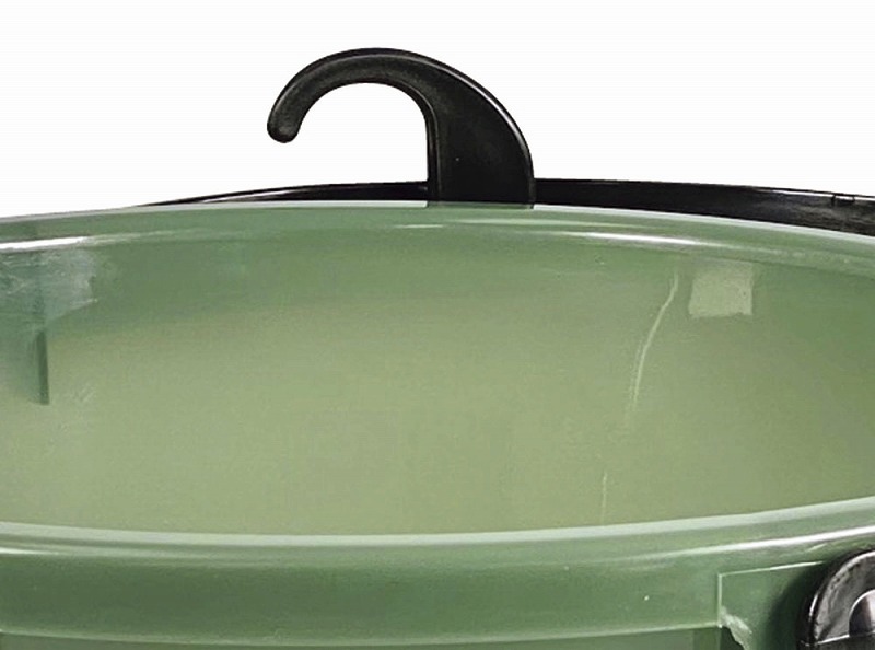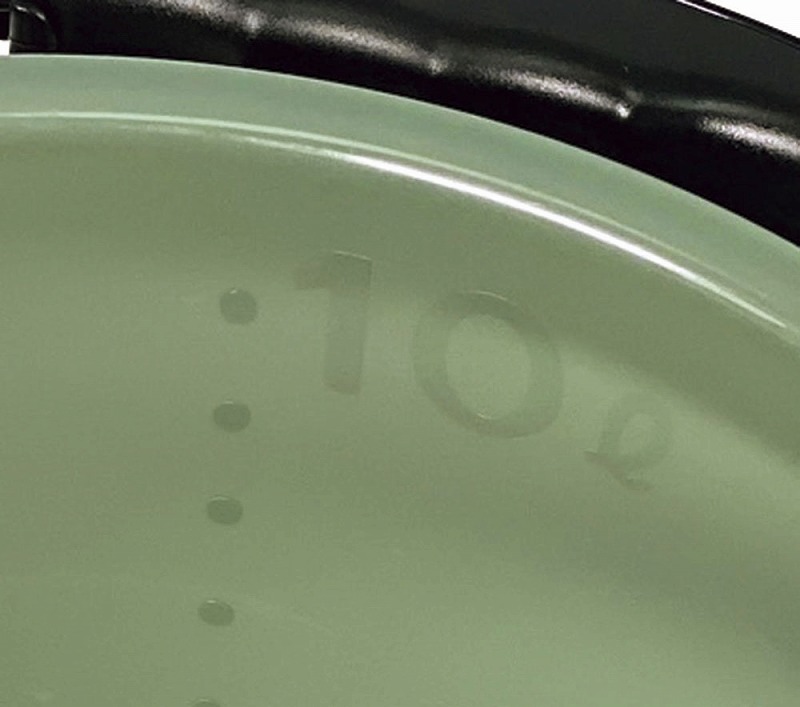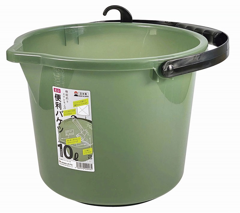 ノズル付ホースがかけられるホースストッパー付き。持ちやすいハンドルカバー付き。底部の持ち手で排水時に少しの力で注ぎも楽々水を流せます。水切りが良い注ぎ口、大きめで使いやすい。大きな文字のメモリ付き。ハンドルを倒すと雑巾もかけられます。