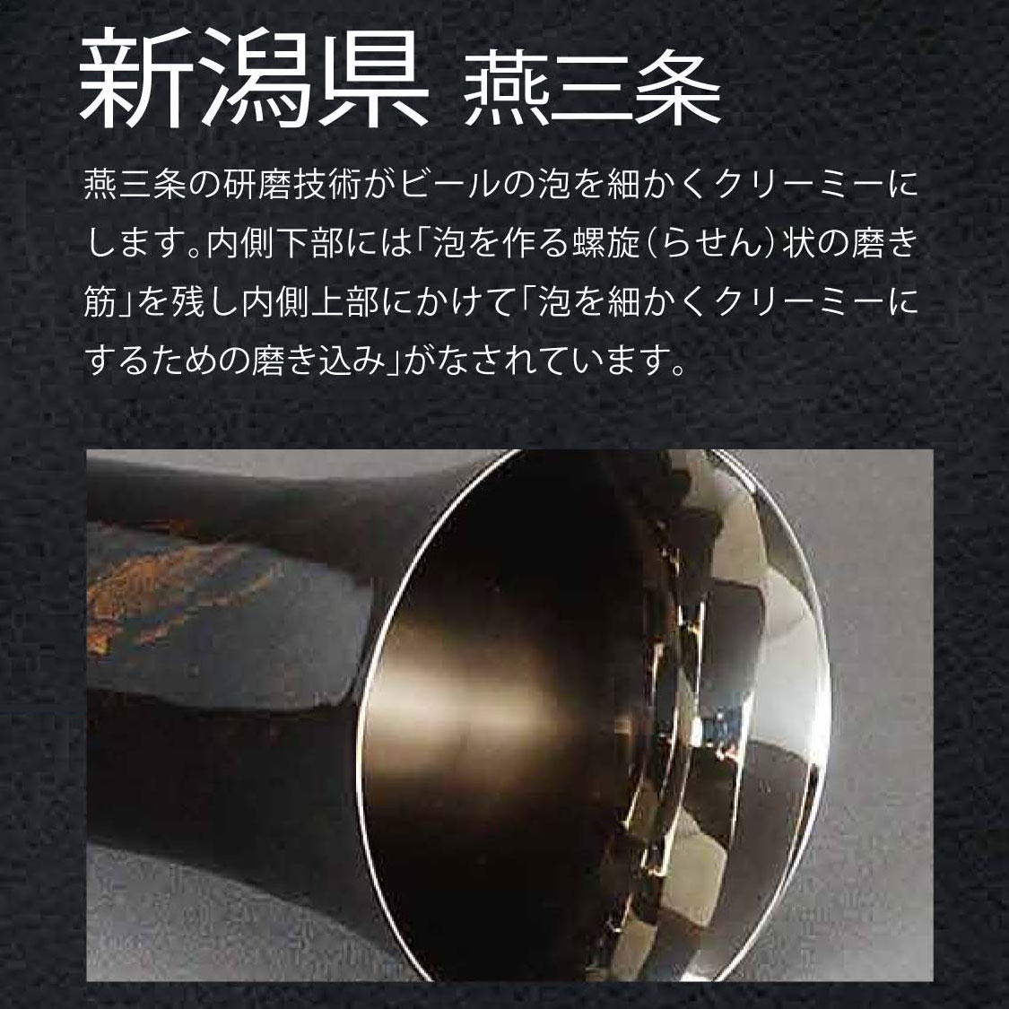 【新潟県・燕三条 】燕三条の研磨技術がビールの泡を細かくクリーミーにします。内側下部には「泡を作る螺旋(らせん)状の磨き筋」を残し内側上部にかけて「泡を細かくクリーミーにするための磨き込み」がなされています。