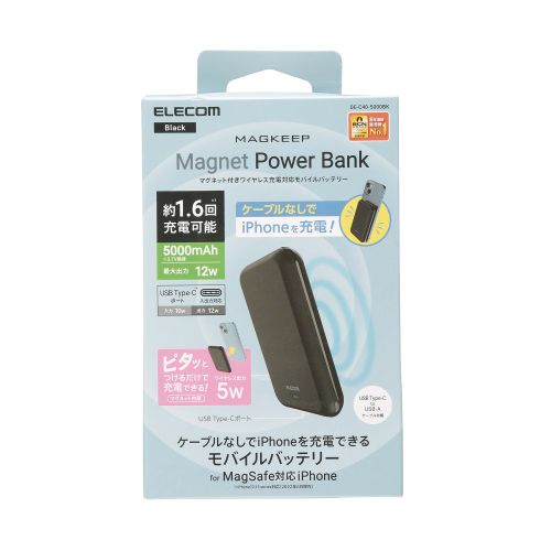 エレコム モバイルバッテリー 5000mAh 12W/入出力(TypeC×1)/ワイヤレス充電/MagSafe対応 ブラック DE-C40-5000BK