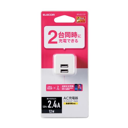 対応機種:2つのUSB Type-Aポートから、それぞれ最大12W(5V/2.4A)、合計最大12W(5V/2.4A)までの出力で充電、使用可能な機器とその組み合わせ