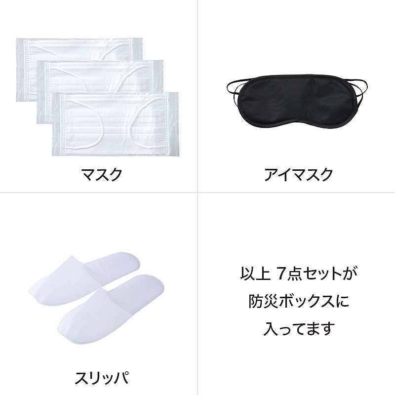 ケース×1・LEDライト×1・アルミシート×1・不織布三角巾×1・圧縮不織布タオル×3・マスク×3・・アイマスク×1・スリッパ×1