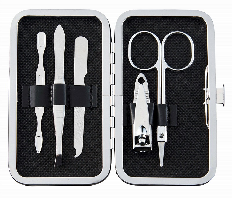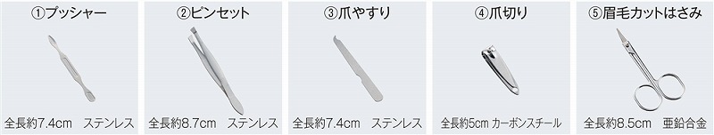 [セット内容] ・プッシャー×1 ・ピンセット×1 ・爪やすり×1 ・爪切り×1 ・眉毛カットはさみ×1