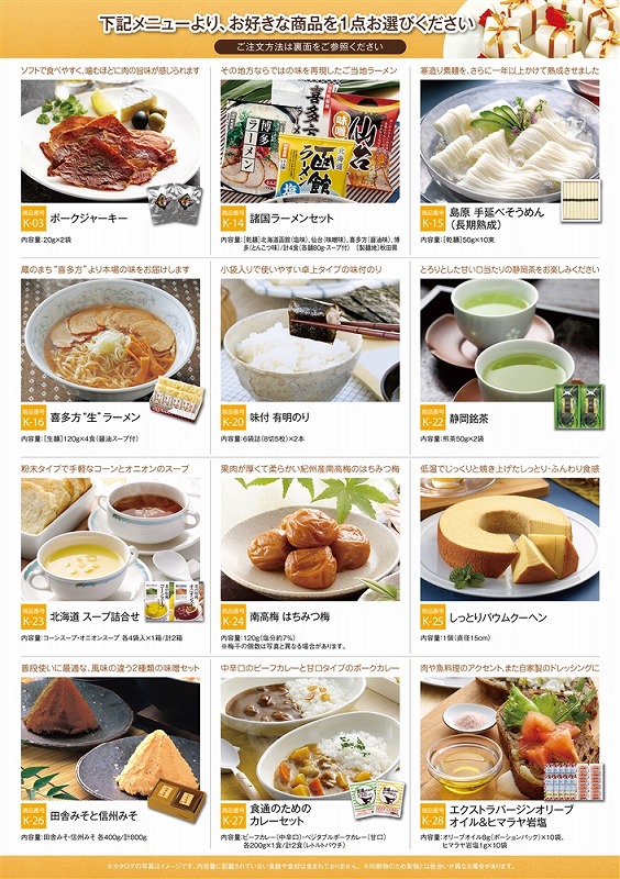 [セット内容] ギフトメニュー(12アイテム) 注文返信用ハガキ(料金受取人払) 個人情報保護シール ※申込み金額合計21000円(カタログ掲載価格)未満は送料別途1000円になります。 ※金額にはシステム料800円が含まれています。 カタログ改定に伴い、商品点数や内容が一部変更となる場合がございますが、ご了承ください。 カタログ誌面はイメージになります。掲載されている商品の内容は異なる場合があります。