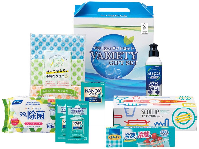 セット内容/洗って使える!不織布クロス3枚・ノンアルコール除菌ウェットティッシュ60枚入・リード冷凍も冷蔵も新鮮保存バッグS3枚入・チャーミーマジカ220ml・スーパーナノックスピロー2包・スコッティキッチンタオル75W