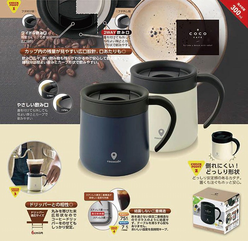 飲み口広ー。熱い飲み物も残りがわかるので安心して飲めます。縁部分は程よい厚みとカーブ形状で飲みやすい。倒れにくいどっしり形状。ドリッパーをのせてもしっかり安定。