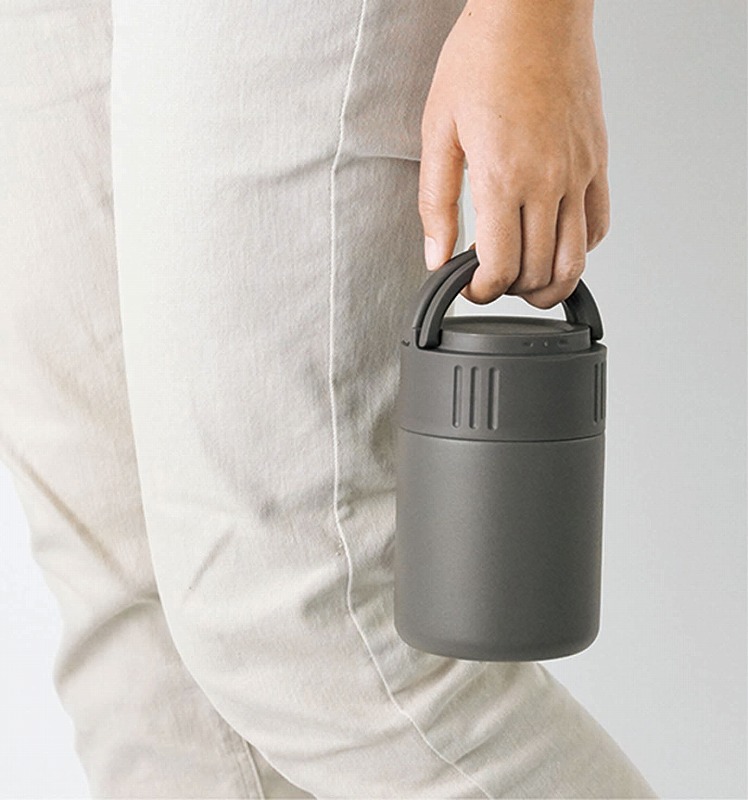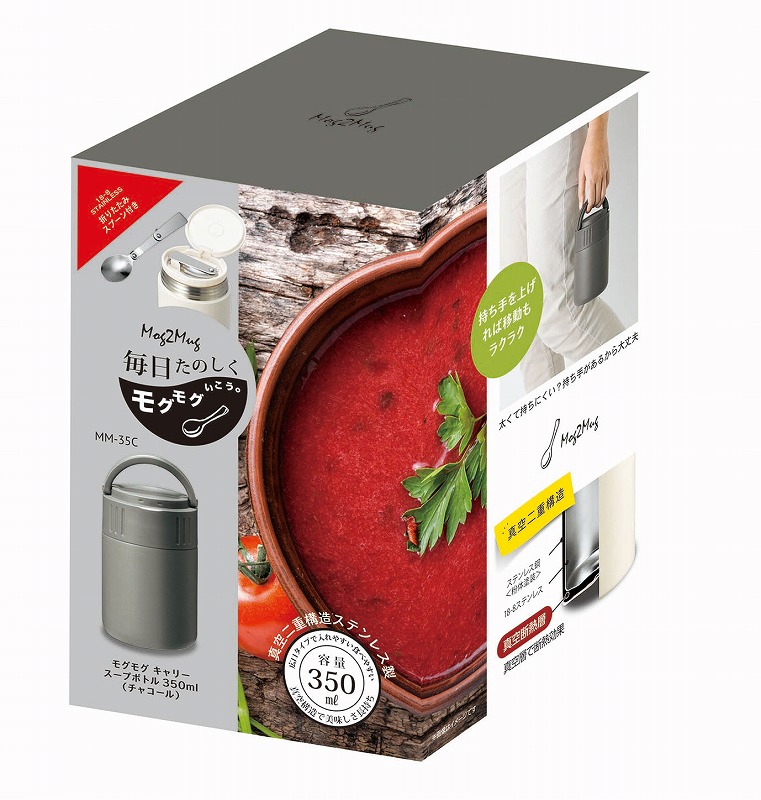持ち運びしやすい持ち手付き、小さく折りたたみできるステンレススプーン付き。ランチまで食べごろの温度をキープできる真空二重構造。