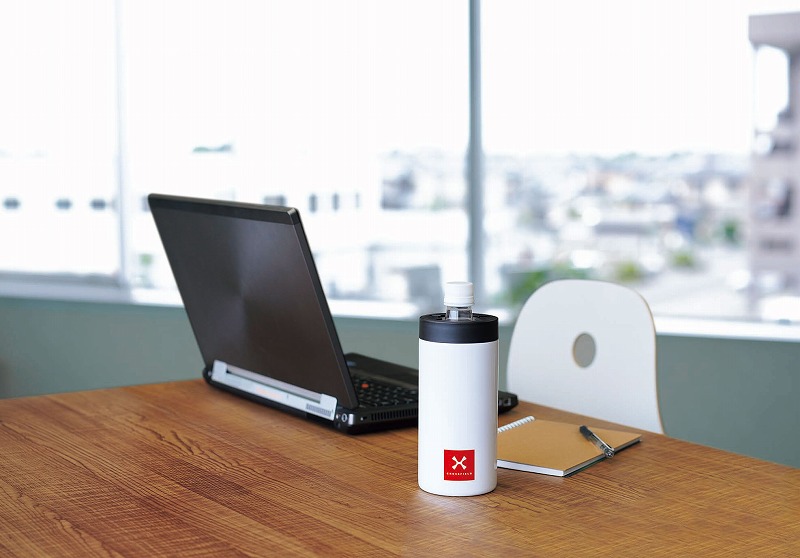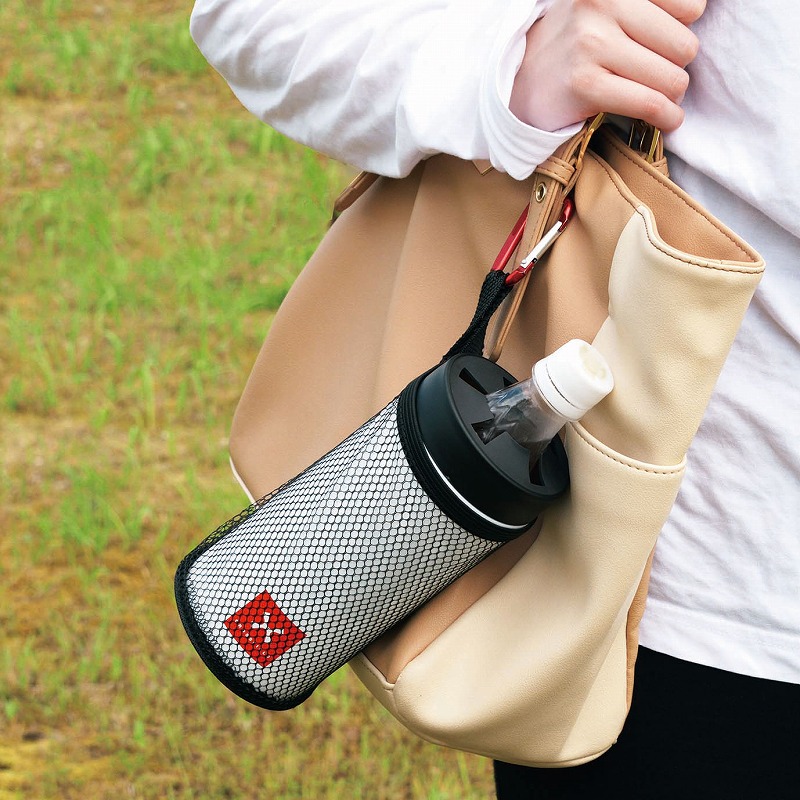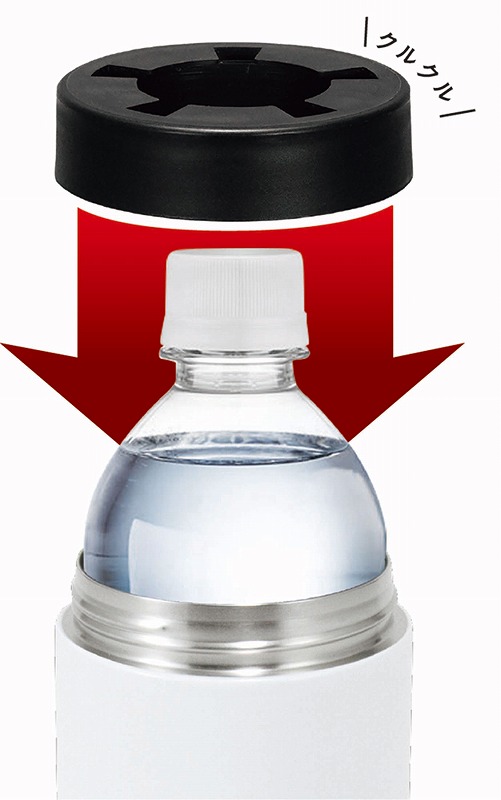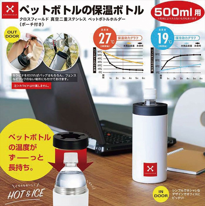 ペットボトルの保温ボトル。 ペットボトルを本体内に入れることで、保温・保冷効果を発揮します。シンプルなデザインで、オフィスにもアウトドアにも向きます。便利なポーチ付き。