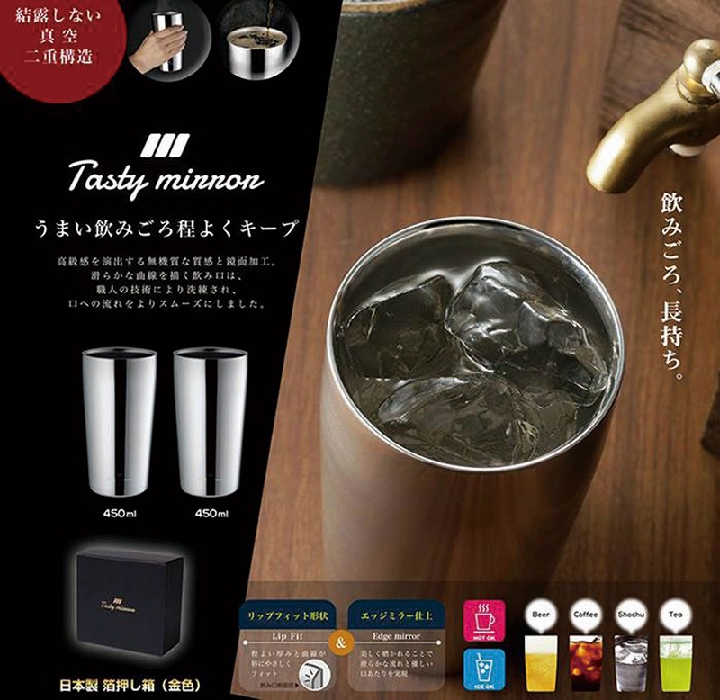 エッジミラー仕上げ。程よい厚みと磨き込まれた美しいミラー加工で、やさしい口あたりを実現。うまい飲みごろ程よくキープ。高級感を演出する無機質な質感と鏡面加工。滑らかな曲線を描く飲み口は、職人の技術により洗練され、口への流れをよりスムーズにしました。