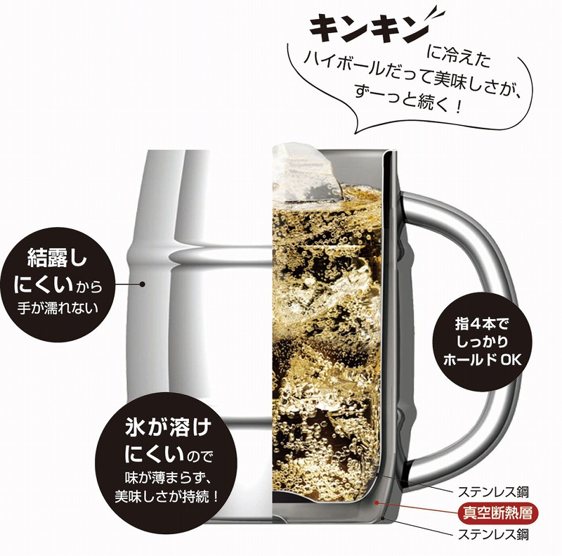 家でも外でもごくごく飲みたくなる!缶でも直でもカンパイをもっと×2楽しもう!350ml缶がジャストフィット!もちろん直接飲み物を入れてもOK!キンキンに冷えたハイボールだって美味しさがずーっと続く!飲み頃温度をキープ真空二重構造!フルオープン缶にも対応!