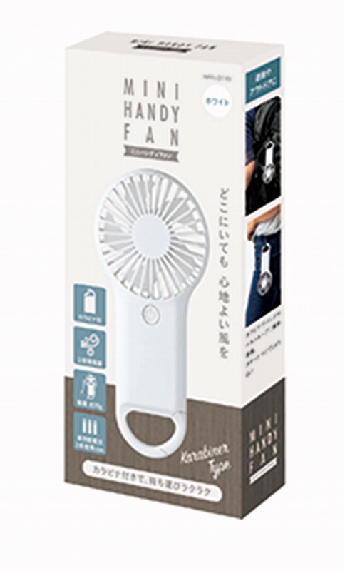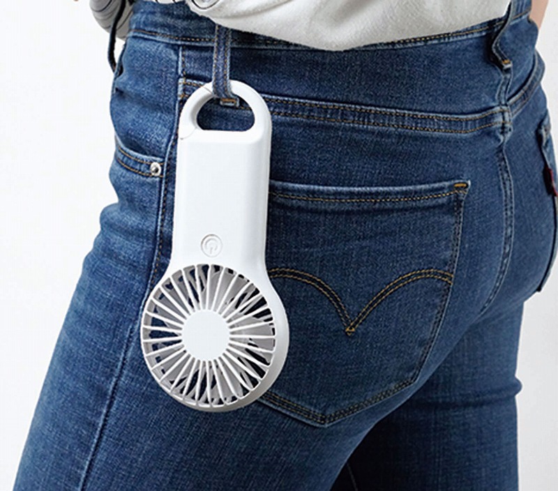 どこにいても、心地よい風を。取り扱いしやすいシンプルなカラビナを搭載。カラビナでバッグやベルトループに簡単装着。カチッとつけてLet’s Go!