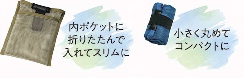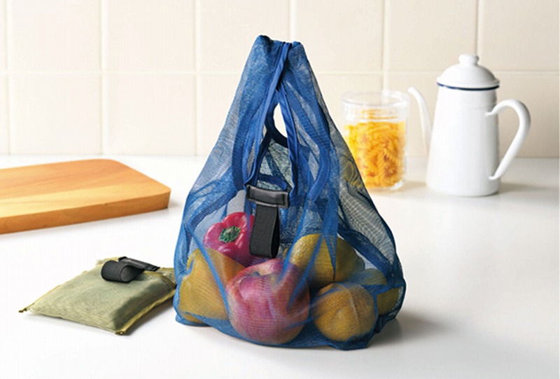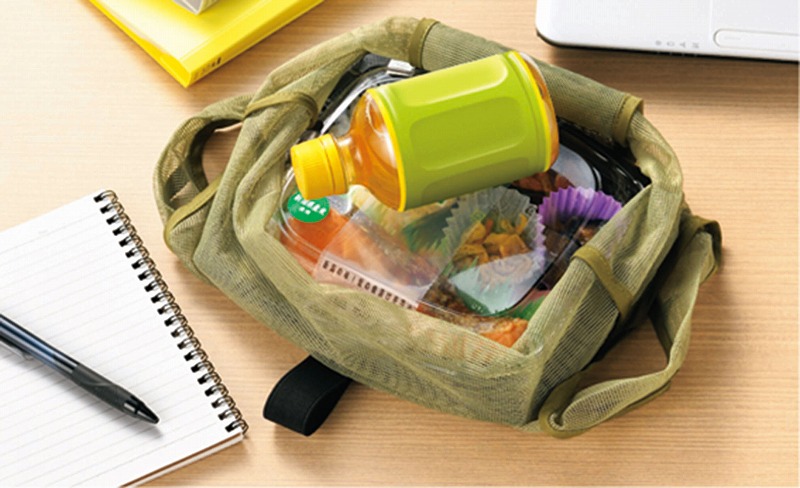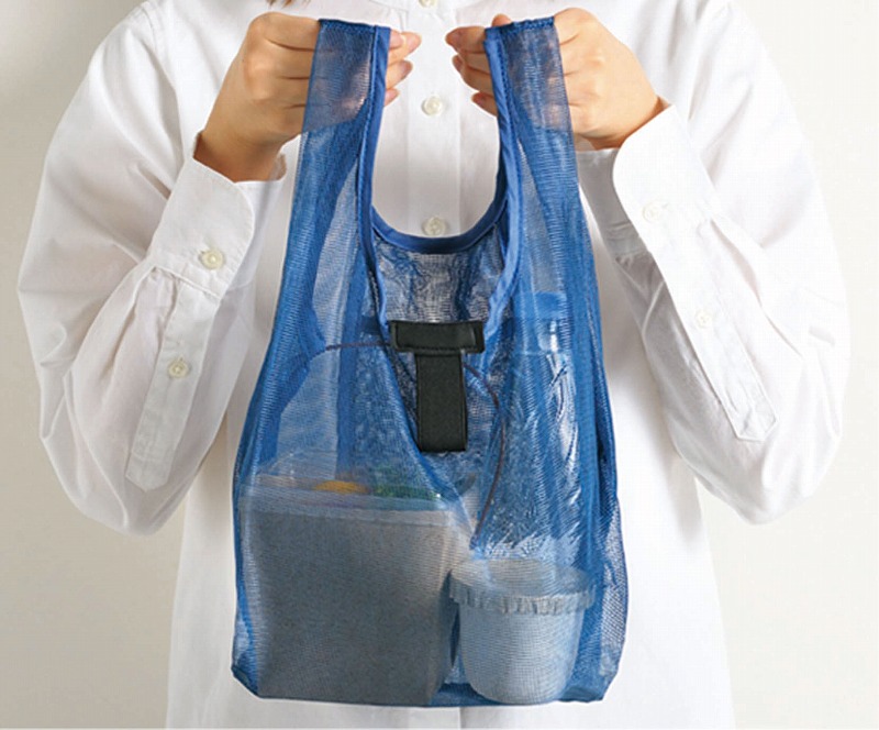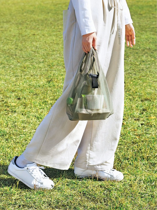 個性派が選ぶ、軽さと透け感。 流行中の透け感が魅力のメッシュ素材。 カジュアルなライトカーキと、シックなダークブルーの2色展開。 自在性の高いマチでいろいろな形のテイクアウトに対応。 小さく丸めてコンパクトに、内ポケットに折りたたんで入れてスリムに。 急な買い物や果物用のサブバッグとしても活躍
