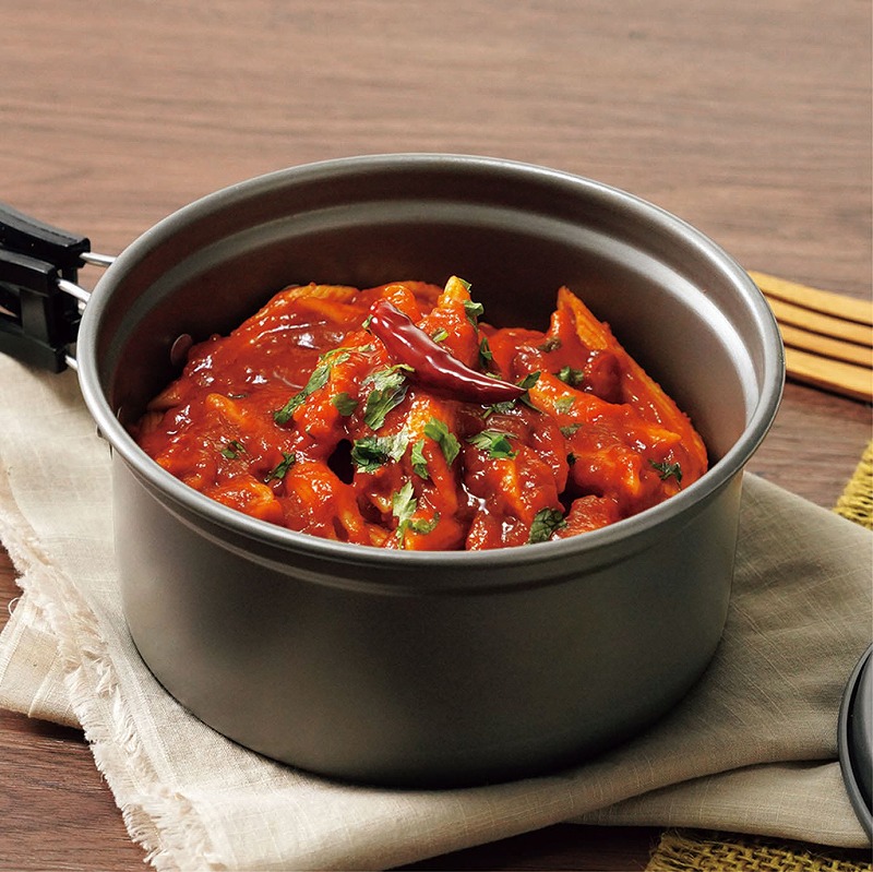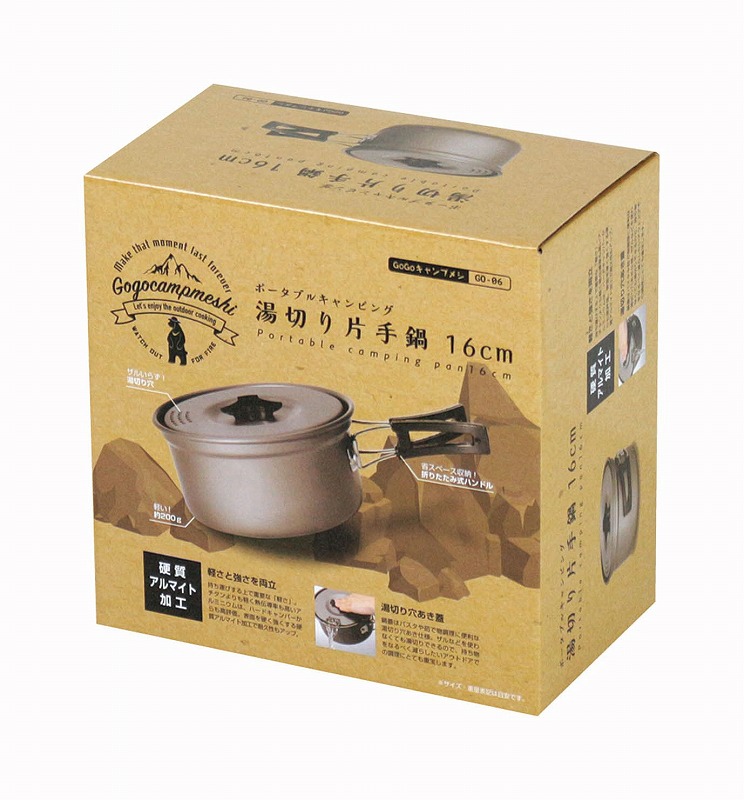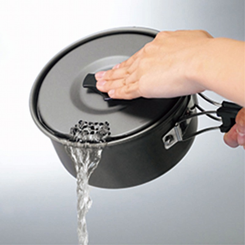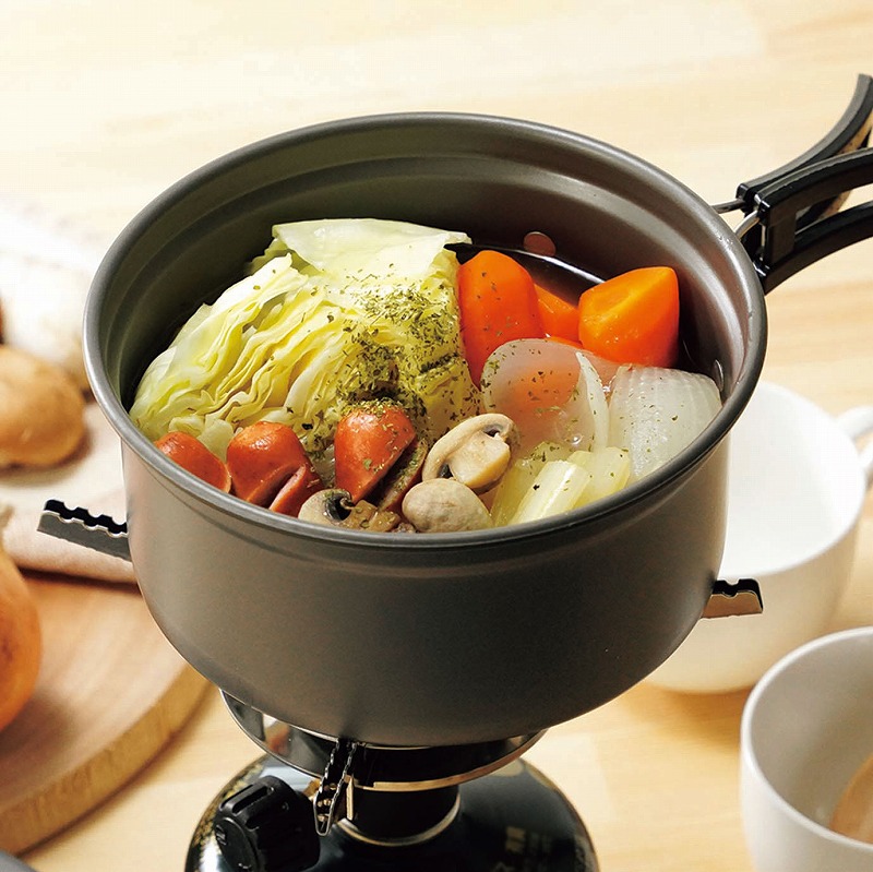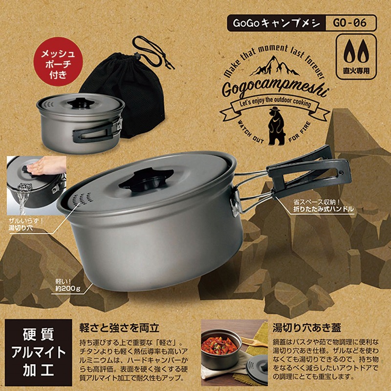 軽さと硬さを両立した硬質アルマイト加工!持ち運びする上で重要な「軽さ」、チタンよりも軽く熱効率も高いアルミニウムは、ハードキャンパーからも高評価。表面を硬く強くする硬質アルマイト加工で耐久性もアップ。 ハンドルが折りたためて、メッシュポーチもついて持ち運びしやすい! 鍋蓋は、パスタや茹で物調理に便利な湯切り穴仕様で使いやすい!