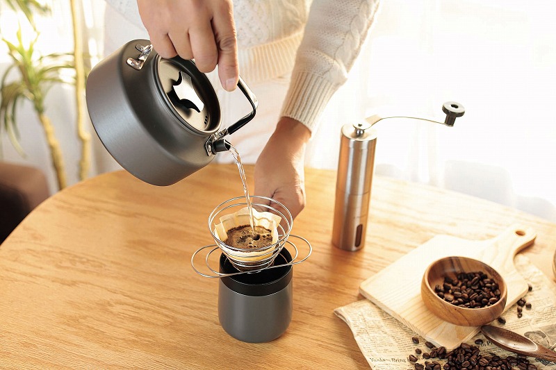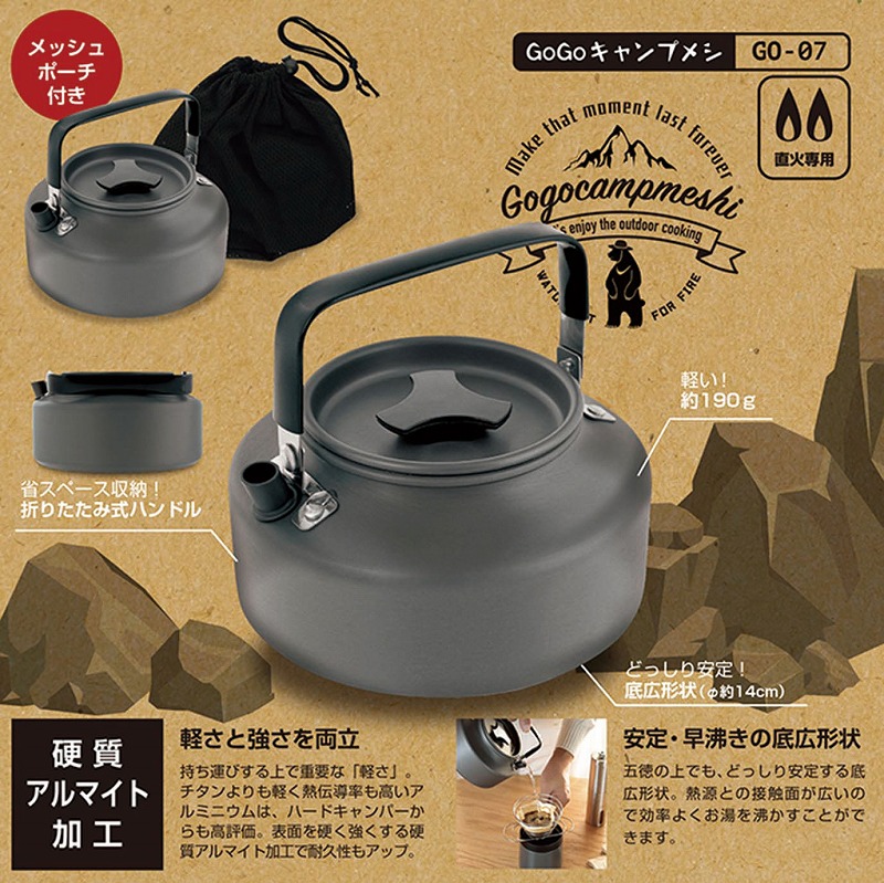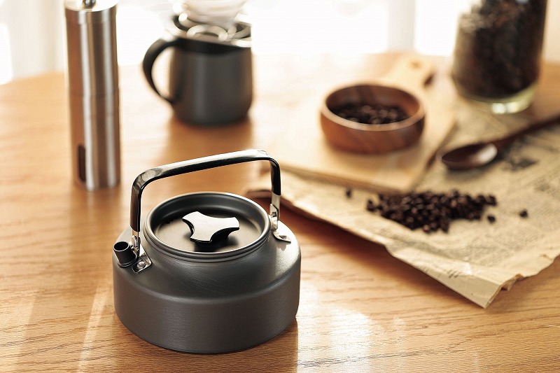 チタンよりも軽く熱伝導率が高いアルミニウム、表面を固く強くする硬質アルマイト加工で軽さと強さを両立。どっしり安定する底広形状で効率よくお湯を沸かすことができます。