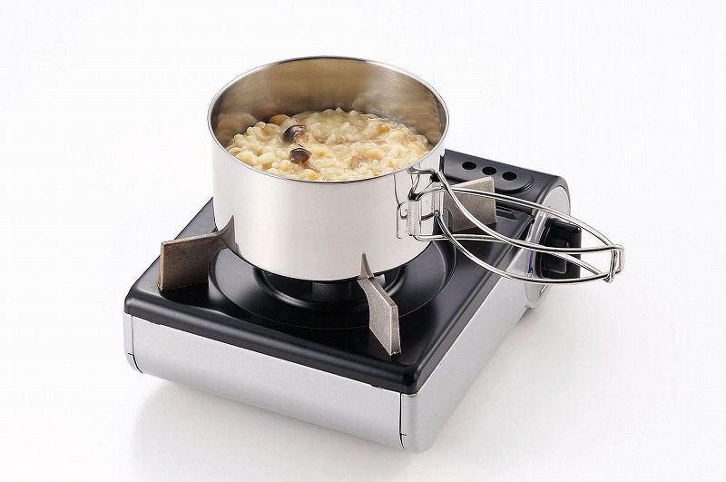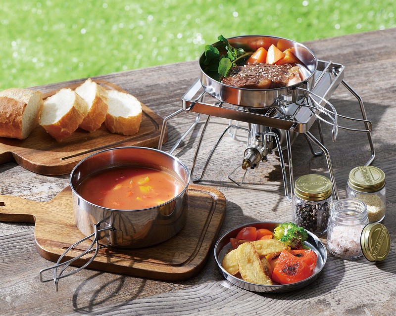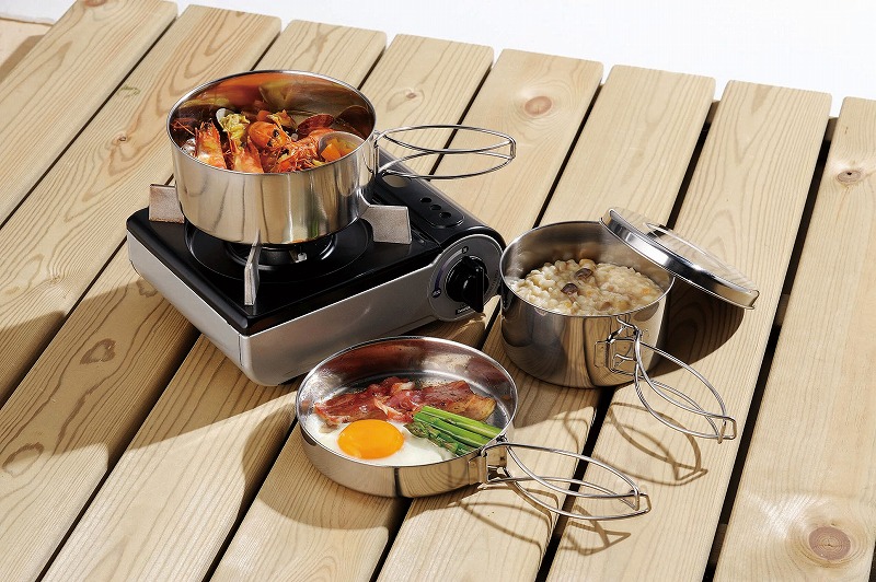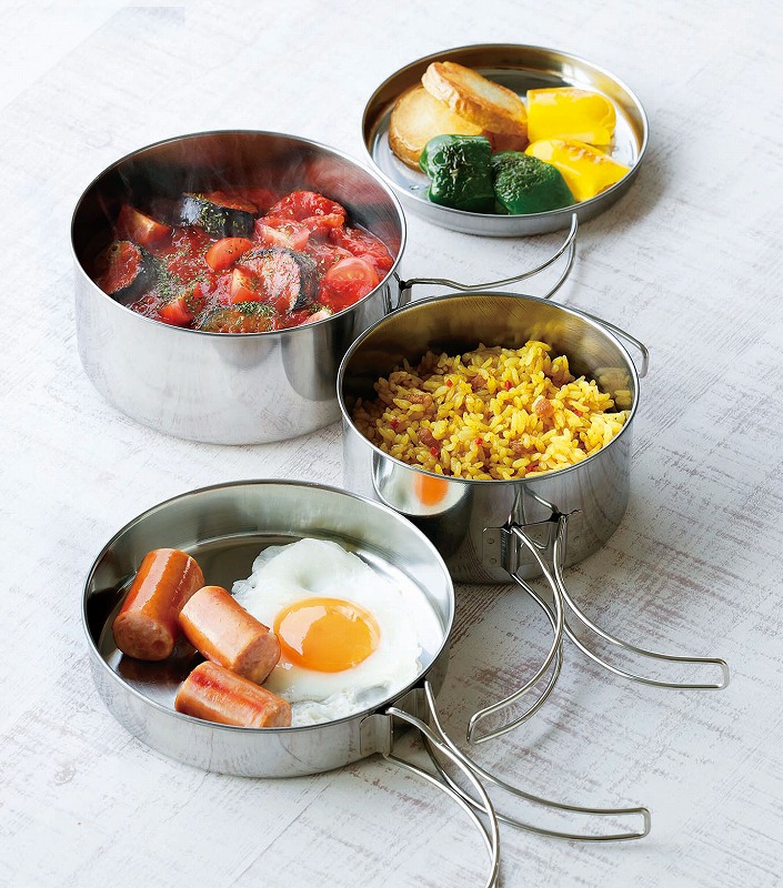 楽しもう!アウトドアパーティ もしもの時の防災サポートにも!アウトドアや非常時に使える調理道具をセットにし、持ち運びに便利な袋に収めました。鍋はコンパクトに収納できます。