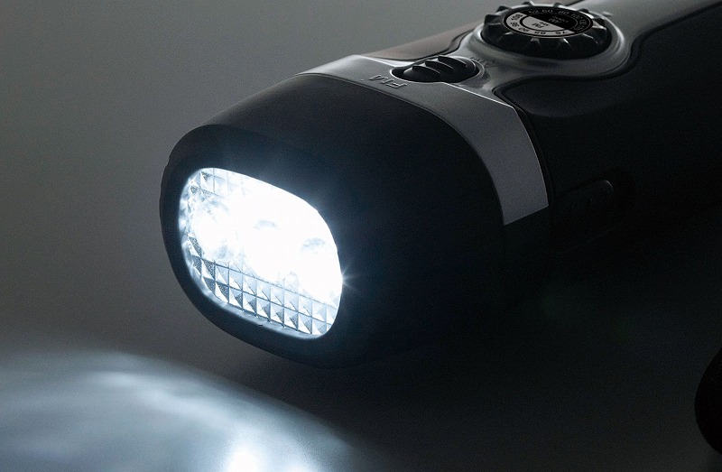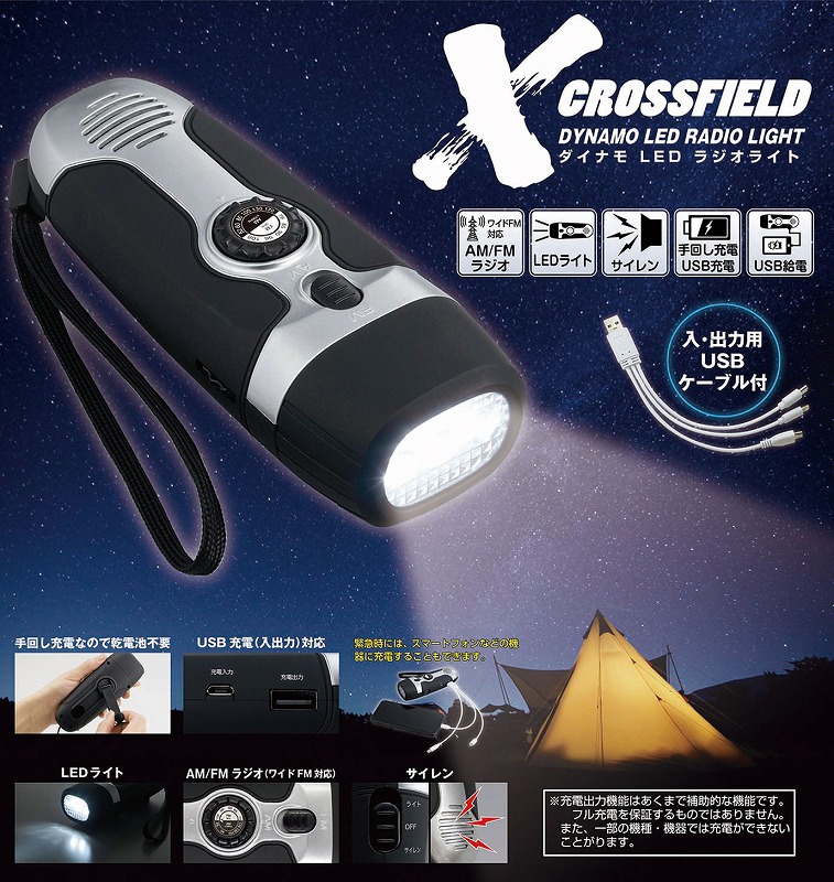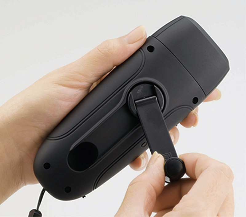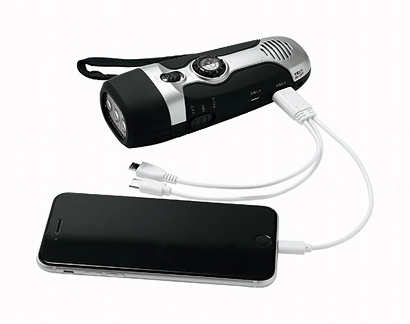 手回し充電なので乾電池不要。 USB充電(入出力)対応。 緊急時には、スマートフォンなどの機器に充電することもできます。 ワイドFM対応。