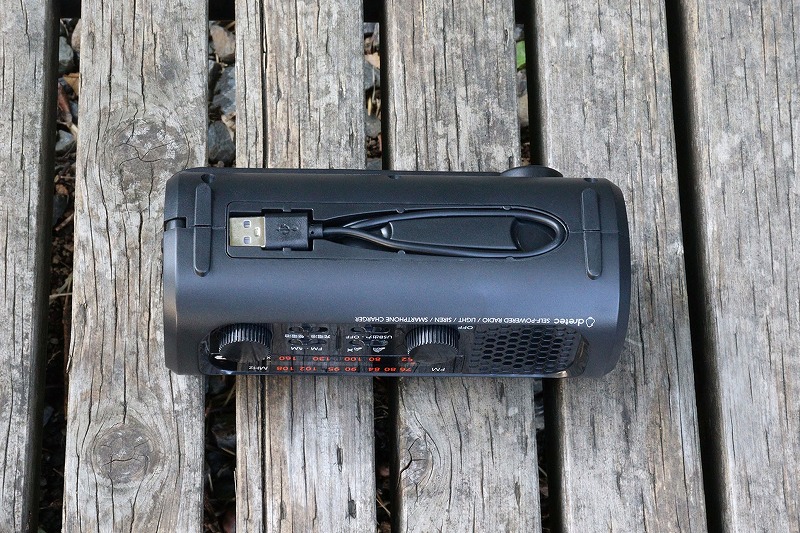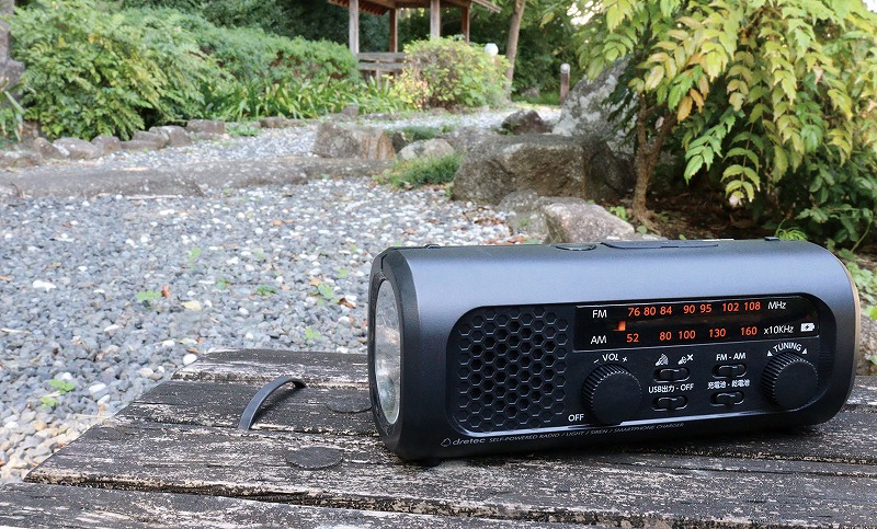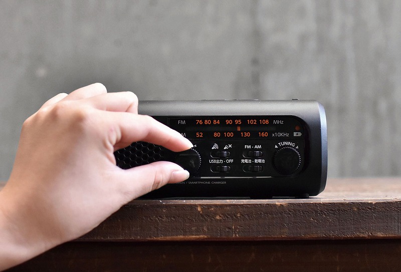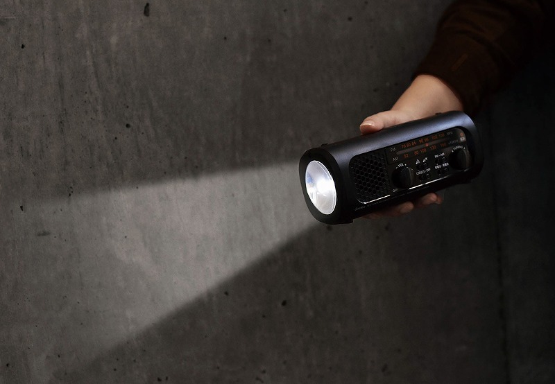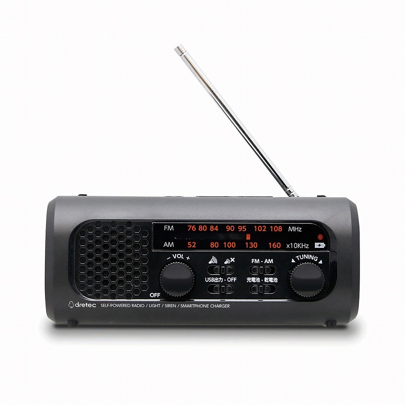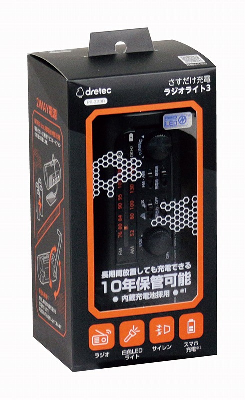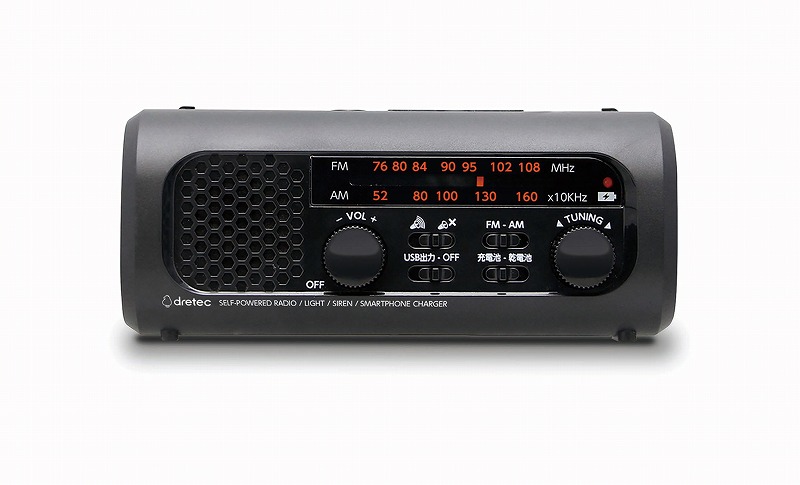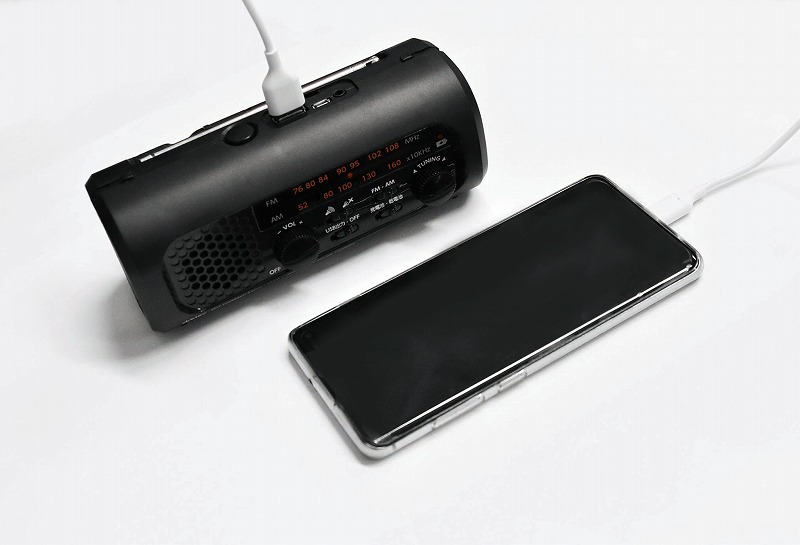 10年間保管可能な内蔵コンデンサ充電池を採用。USBにさし込むだけでスマートフォン・携帯電話への充電ができます。乾電池のほか、手回し発電で内蔵充電池を充電できます。突然の災害時に便利なサイレン機能。停電時に便利な白色LEDライト。