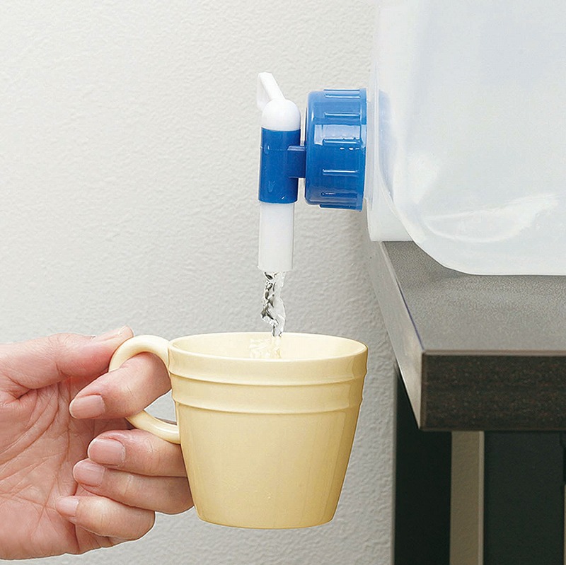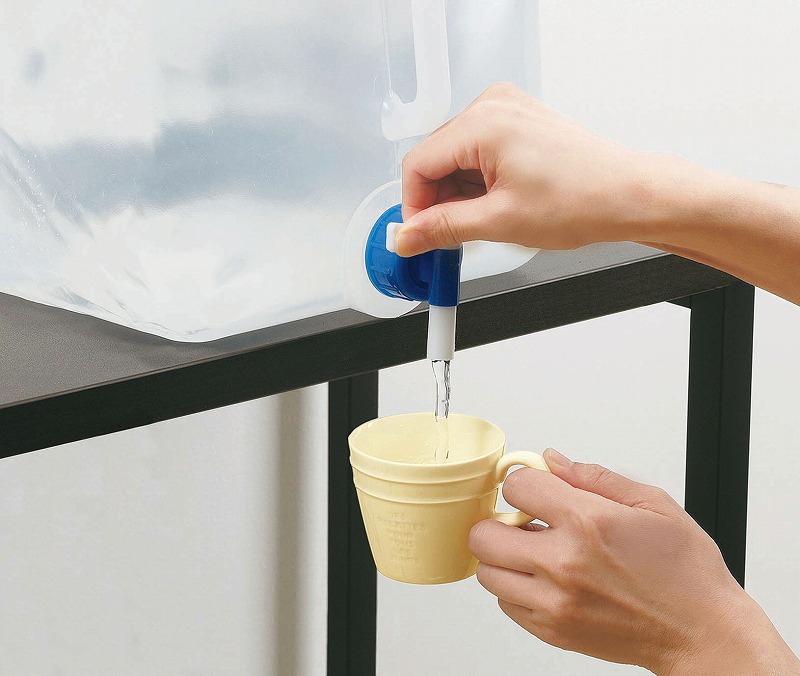 断水など緊急時の備えに、レジャーやキャンプに。コック付きだから簡単給水。折りたためるので、保管・持ち運びに便利。取っ手付きで持ち運び楽ー。