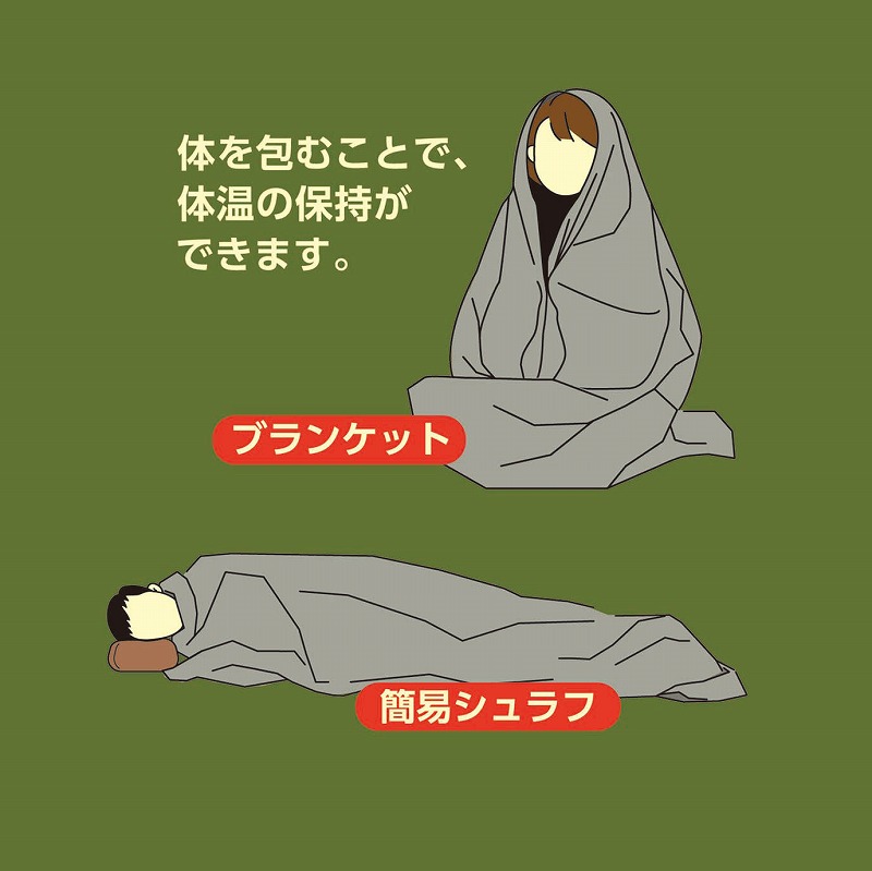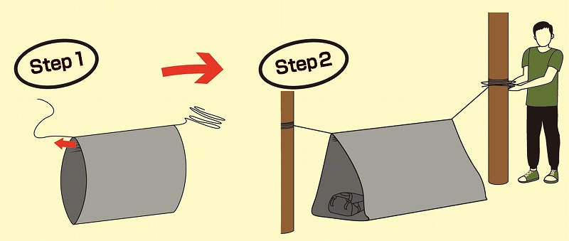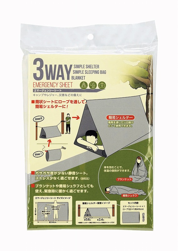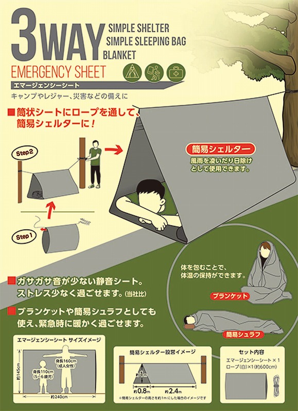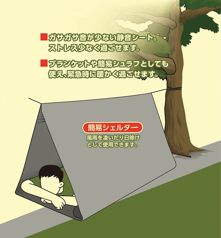 筒状シートにロープを通して、簡易シェルターに!風雨を凌いだり日除けとして使用できます。ブランケットや簡易シュラフとして体を包むことで、体温の保持ができます。ガサガサ音が少ない静音シートでストレス少なく過ごせます。キャンプやレジャー、災害などの備えに!