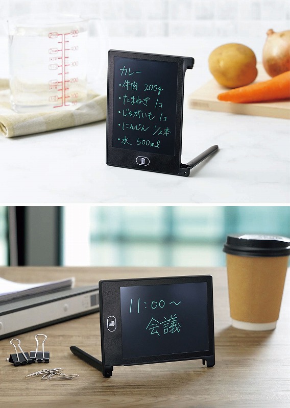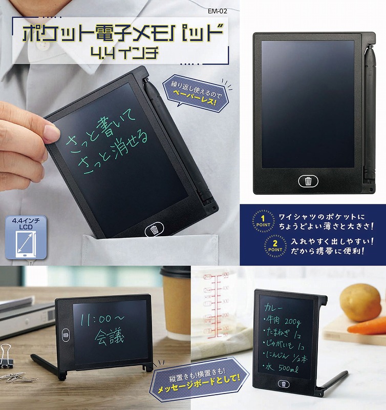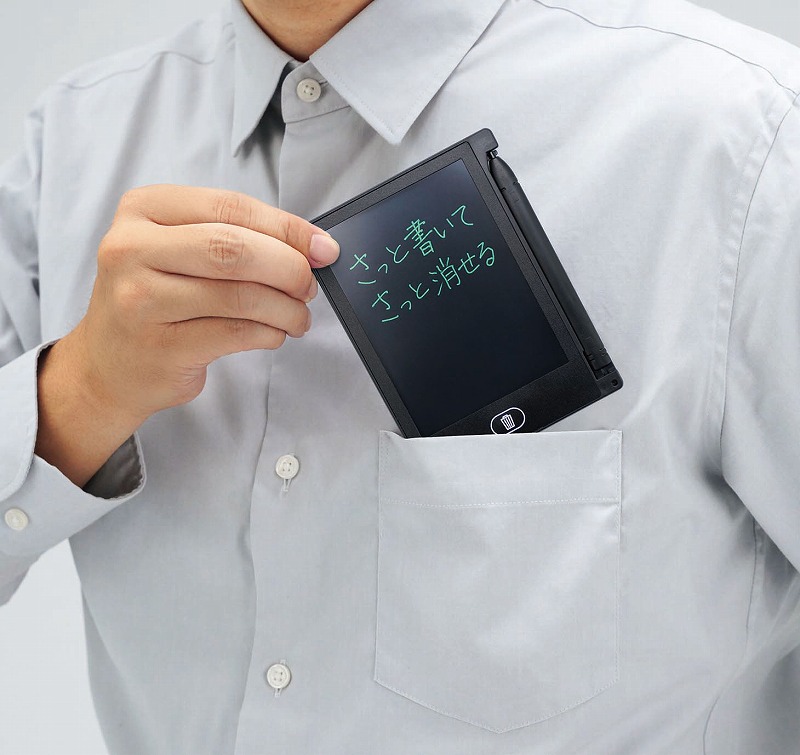 ワイシャツのポケットにちょうどよい薄さと大きさの、何度も繰り返し使えるペーパーレスな電子メモパッド!小さすぎもしないので出し入れしやすく携帯に便利!専用ペンで縦向きにも横向きにもスタンド可能!