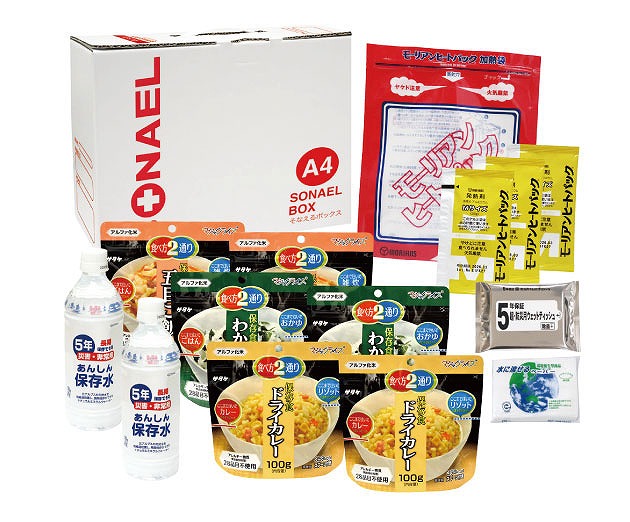 ウェットティッシュ・水に流せるペーパー・5年保存水500ml×2・マジックライス(わかめ・五目・ドライカレー)×各2・加熱袋・発熱剤×3