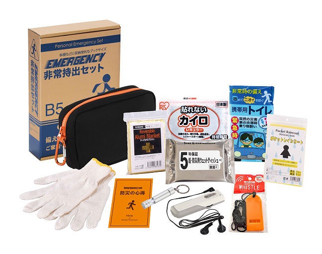 収納ポーチ・防災の心得・ホイッスル・カイロ・レインコート・携帯用トイレ・LEDライト・FMラジオ・軍手・アルミブランケット・ウェットティッシュ