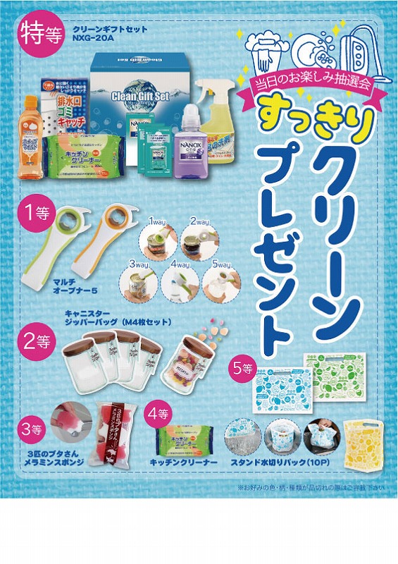 特等:クリーンギフトセットNXG20A×2、1等:マルチオープナー5×4、2等:キャニスタージッパーバッグM4枚×6、3等:3匹のブタさんメラミンスポンジ×8、4等:キッチンクリーナー20P×10、5等:スタンド水切りパック10P×70、三角くじ×人数分、抽選箱×1、明細表×1、A3ポスター×1、POP×2枚