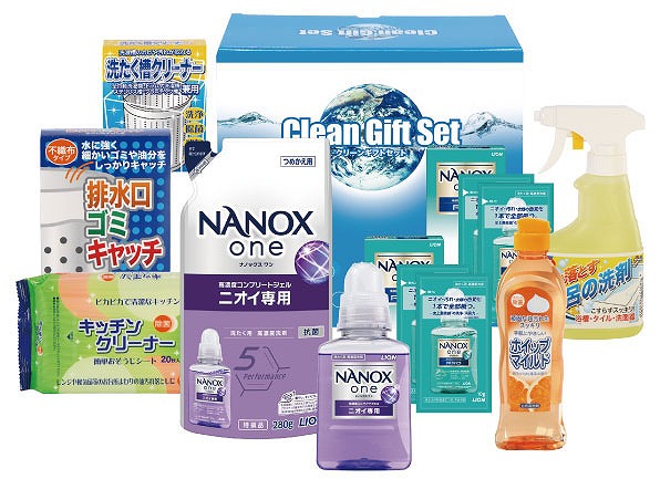 NANOX(380g)×1・NANOX(280g詰替)×1・NANOX2P×2・台所洗剤(250ml)×1・お風呂の洗剤スプレー(300ml)×1・キッチンクリーナー(20P)×1・洗たく槽クリーナー×1・排水口ゴミキャッチ(8P)×1