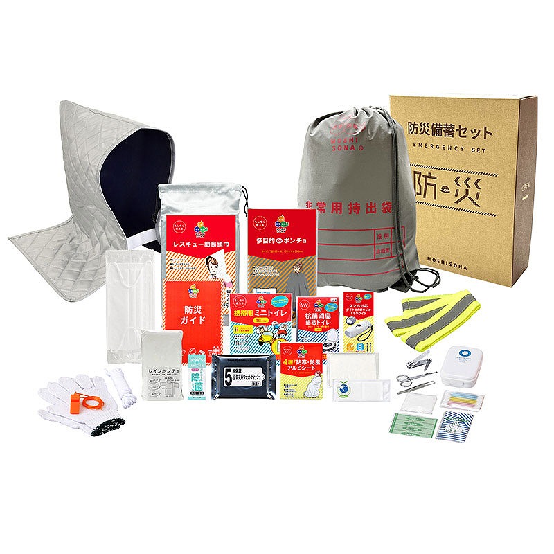 セット内容:(1)反射de持出リュック、(2)多目的deポンチョ、(3)レスキュ簡易頭巾、(4)スマホ対応ダイナモFMラジオLEDライト (※?)、(5)抗菌消臭・簡易トイレ、(6)携帯用ミニトイレ、(7)防災ガイド、(8)マスク、(9)ポケットティッシュ、(10)eco便利バッグ、(11)4層!アルミシト、(12)防災用ウェット ティッシュ(20枚入)、(13)除菌ジェル、(14)レインポンチョホワイト、(15)軍手、(16)ロプ、(17)笛、(18)新反射安全タスキ、(19)絆創膏5枚、(20)綿棒10P、?コットンパフ3枚、?ワンタッチ包帯、?爪切 り、?毛抜き、?ハサミ