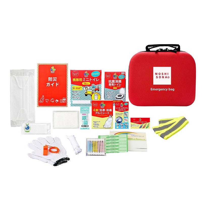 セット内容:(1)エマジェンシdeバッグ、(2)抗菌消臭・簡易トイレ、(3)携帯用ミニトイレ、(4)防災ガイド、(5)マスク、(6)新反射安全タスキ、(7)アルミLEDライト&ホイッスル(3色アソト)、(8)新ソラ&ダイナモLEDライト(3色アソト)、(9)4層!アルミシト、(10)除菌ジェル、(11)ポケットティッシュ、(12)eco便利バッグ、(13)絆創膏5枚、(14)綿棒10P、(15)軍手、(16)ロプ、(17)笛