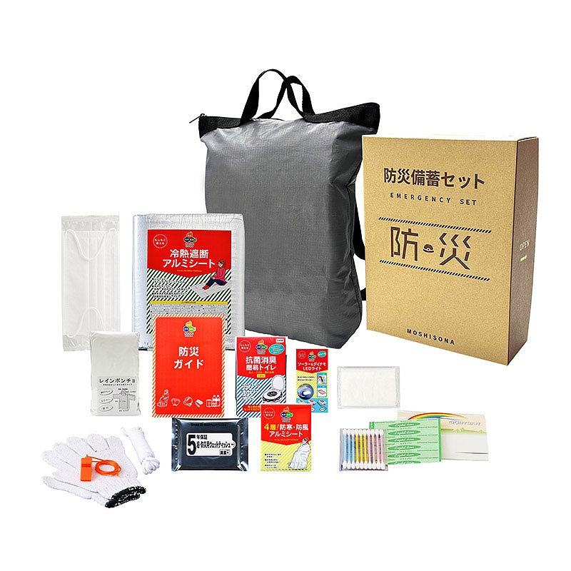セット内容:(1)収納deリュック、(2)冷熱遮断アルミシト、(3)マスク、(4)ポケットティッシュ、(5)新ソラ&ダイナモLEDライト(3色アソト)、(6)抗菌消臭・簡易トイレ、(7)防災ガイド、(8)レインポンチョホワイト、(9)絆創膏5枚、(10)綿棒10P、(11)4層!アルミシト、(12)防災用ウェットティッ シュ (20枚入)、(13)軍手、(14)ロプ、(15)笛