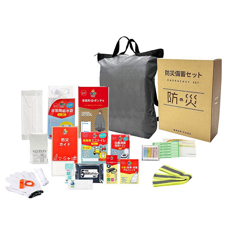 セット内容:(1)収納deリュック、(2)多目的deポンチョ、(3)非常用給水袋3L、(4)マスク、(5)絆創膏5枚、(6)綿棒10P、(7)抗菌消臭・簡易トイレ、(8)携帯用ミニトイレ、(9)防災ガイド、(10)レインポンチョホワイト、(11)新反射安全タスキ、(12)4層!アルミシト、(13)ラジオdeライト(単4電池×3本使用 別売)、(14)防災用ウェットティッシュ (20枚入)、(15)ポケットティッシュ、(16)除菌ジェル、(17)eco便利バッグ、(18)軍手、(19)ロプ、(20)笛