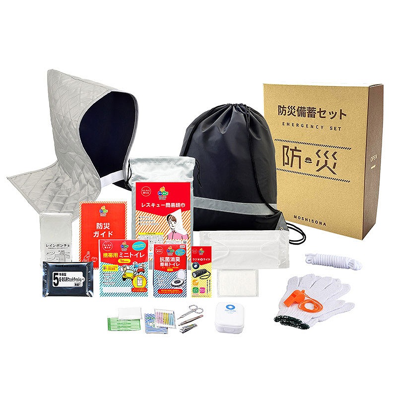 セット内容:(1)巾着リュック、(2)レスキュ簡易頭巾、(3)防災ガイド、(4)レインポンチョホワイト、(5)マスク、(6)ポケットティッシュ、(7)ラジオdeライト(単4電池×3本使用 別売)、(8)抗菌消臭・簡易トイレ、(9)携帯用ミニトイレ、(10)防災用ウェットティッシュ(20枚入)、(11)軍手、(12)ロプ、(13)笛、(14)絆創膏5枚、(15)綿棒10P、(16)コットンパフ3枚、(17)ワンタッチ包帯、(18)爪切り、(19)毛抜き、(20)ハサミ