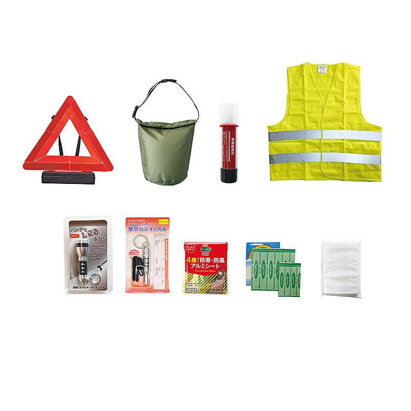 セット内容:(1)マルマキバック(ブラック/カキ)(色指定不可)、(2)バイク専用三角停止表示板、(3)LED非常信号灯(テスト電池付き)、(4)ハンディLEDライト(テスト電池付)、(5)防寒防風アルミシト(2130mm×1370mmサイズ)、(6)緊急用ホイッスル(ストラップ付)、(7)ポケットティッシュ8W、(8)絆創膏(M3枚、S2枚)、(9)蛍光安全ベスト(フリサイズ)