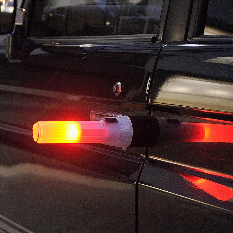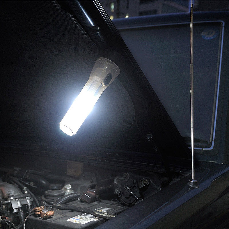 車体に取り付け非常信号用具にもなる、軽くて持ちやすい多目的LEDライトです。 レジャーに!防災に!車の非常時に!家庭に一台あれば重宝します。手元のスイッチで、ライトの「強」、「弱」、ランタンの「強」、「弱」、「赤点滅」に切り替えられます。ライト頭部には、ネオジウム磁石(4個)が付いており、ランタンとして使用可能!吊り下げ用フック付。単3・単4電池使用可。