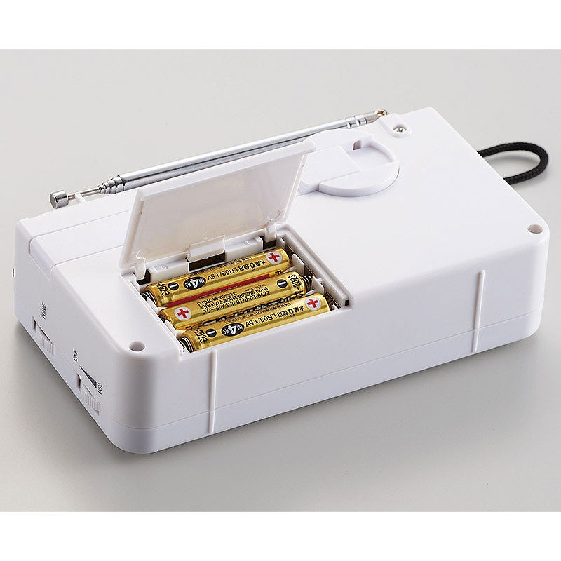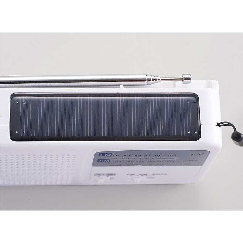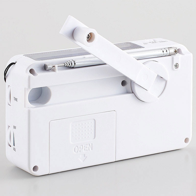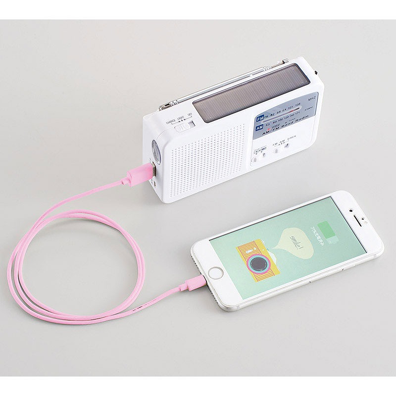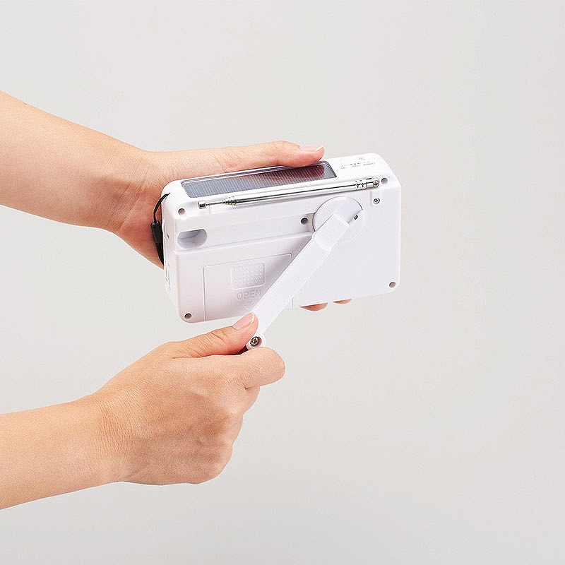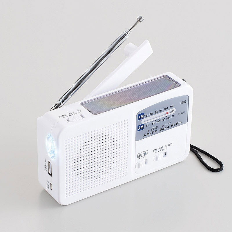 3電源と4機能を持った防災用ライト。ダイナモとソーラーの充電と乾電池が使用出来る3電源方式。ライト、ラジオ(AM/FM/ワイドFM対応)、サイレン、スマホ・携帯電話充電が可能。(iPhoneはお手持ちのライトニングケーブルを使用で充電可)
