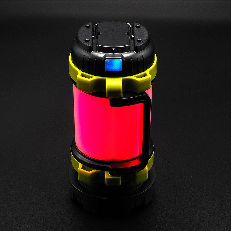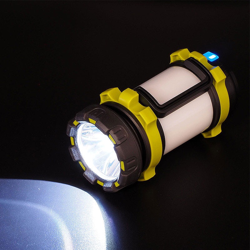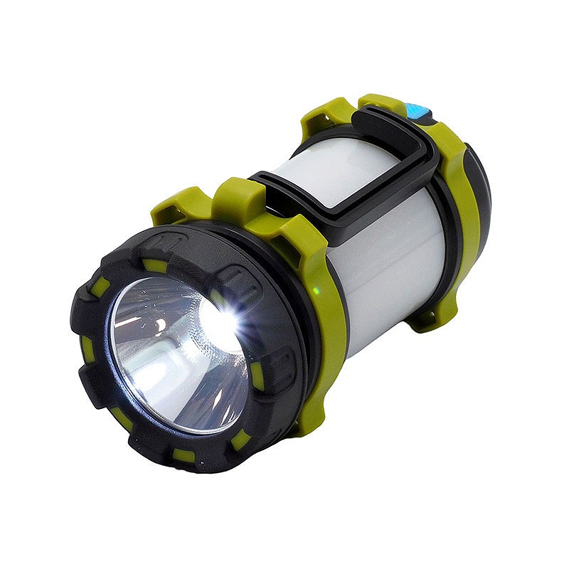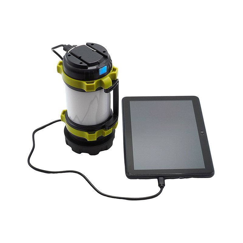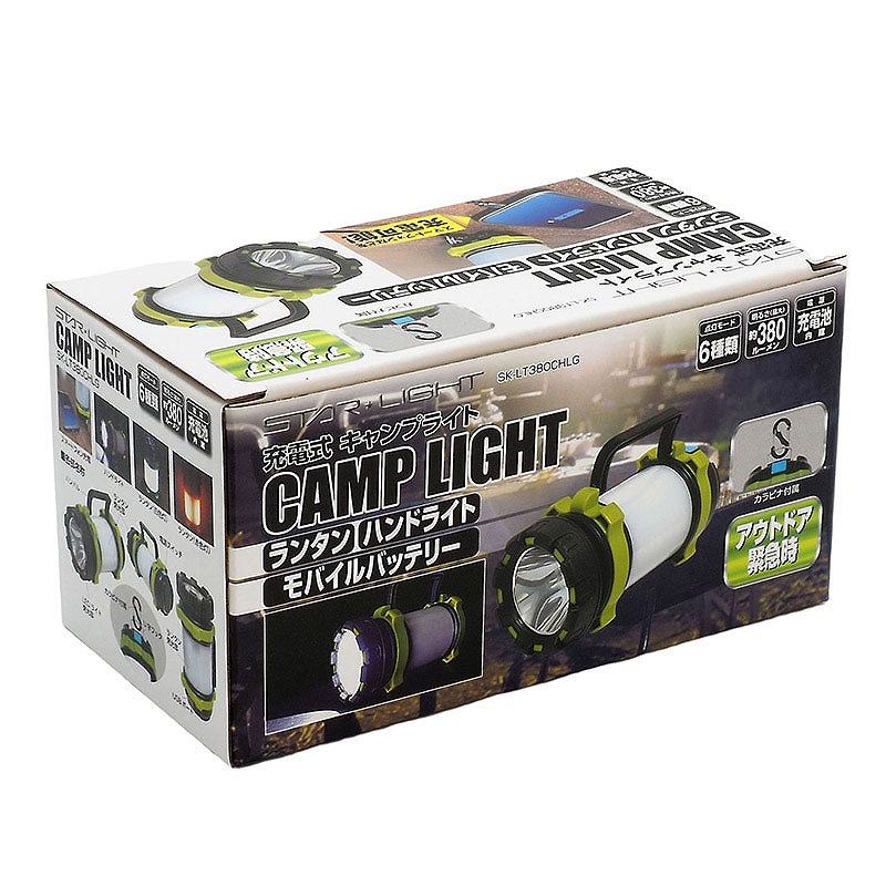 ハンドライトにもバッテリーにもなる充電式ランタン。明るさ約380ルーメン。点灯モードは6種類。ハンドライト2モード(白色:強/弱)、ランタン4モード(白色:強/弱、赤色:強/点滅)。3000?Ah充電池を内蔵しモバイルバッテリーとしてスマートフォン等への電源供給が可能。