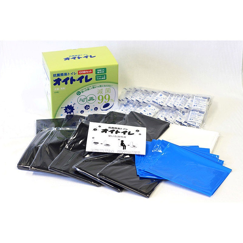 内容物:トイレ用袋(黒)100枚、カバ袋(青)5枚、処理用袋(白)10枚、抗菌性凝固剤 100個、説明書